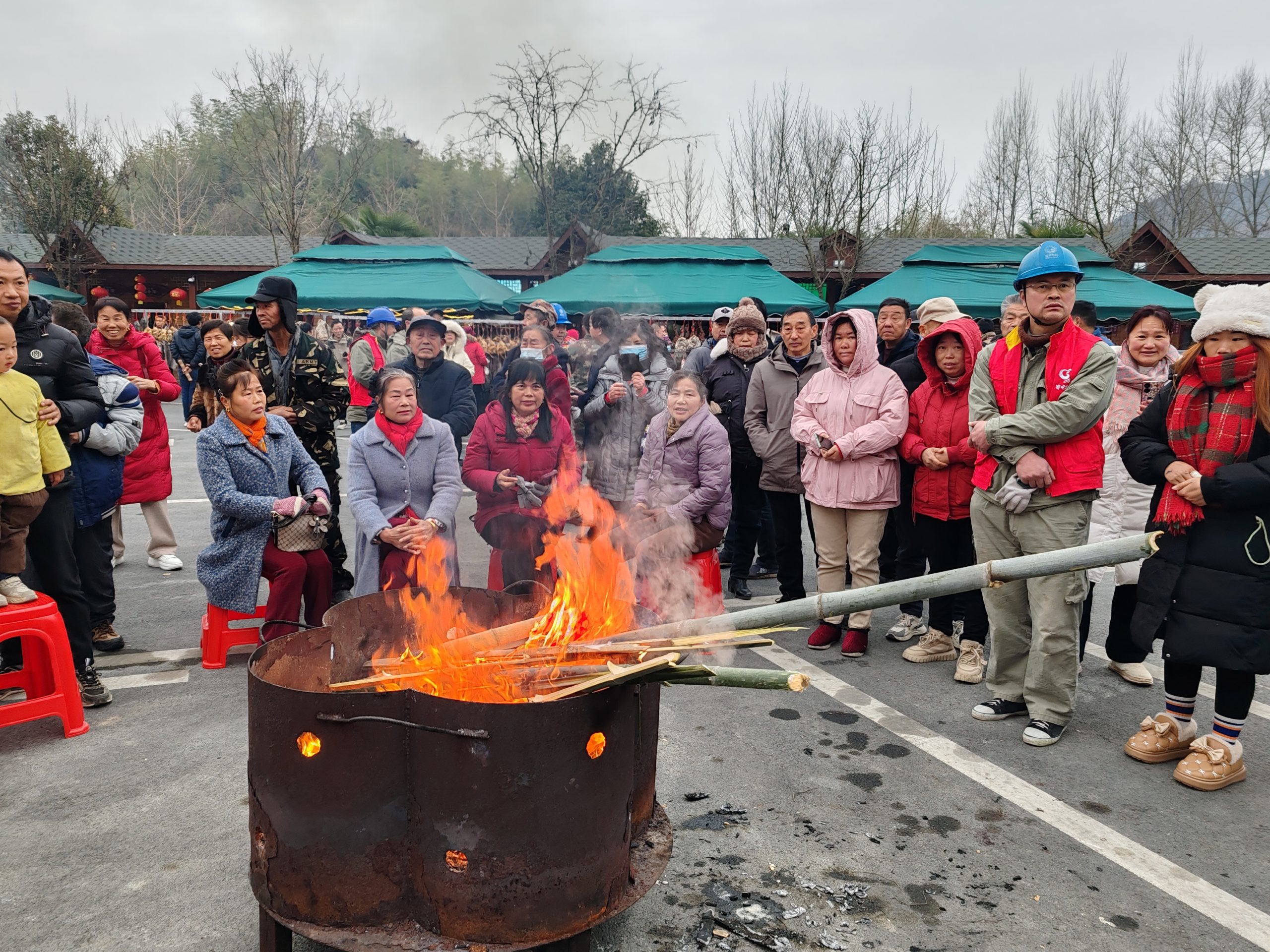来到“百家宴”现场,80张桌子上摆放了800余道农家自制、风味独特的传统菜肴,碳锅腊蹄、红烧肉、排骨藕汤、黄精土鸡汤、时令蔬菜、黄酒、腊八粥等组成腊八宴,还有市级非物质文化遗产——五山八大碗现场制作品尝,香气四溢,令人垂涎欲滴,各种美食的香气交织在一起,形成了一股独特的“年味”,大家围坐在桌子前,品尝着各式佳肴。