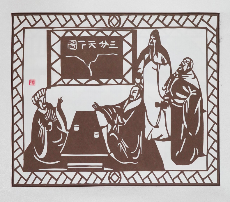 典故《三分天下》是诸葛亮为刘备分析天下形势提出先取荆州为家,再取益州继而图取中原的战略构想。张玉勤结合襄阳本土文化创作三国题材系列剪纸作品,以剪纸艺术的形式再现了“隆中对”这一重要的历史场景。襄阳剪纸作为一种传统民间艺术,具有独特的艺术风格和文化内涵。通过剪纸这种形式,不仅展现了诸葛亮的足智多谋和高瞻远瞩,以及刘备求贤若渴的形象,更将这一经典的历史时刻凝固下来,让后人能够以一种直观的方式感受那段波澜壮阔的历史,领略古代战略智慧的魅力。