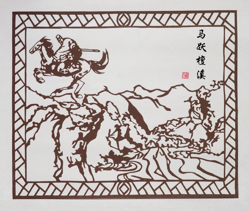 襄阳剪纸作为独特的民间艺术形式,有着深厚地域文化底蕴。张玉勤巧妙运用剪纸艺术,通过细腻的线条、独特的构图,将刘备与“的卢”马的惊险瞬间凝固于纸上。每一处线条的勾勒,都饱含着创作者对历史故事的深刻理解;每一片图案的剪裁,都彰显着襄阳剪纸艺术的独特魅力,让这一古老传说在剪纸艺术中焕发出新的生机与活力。