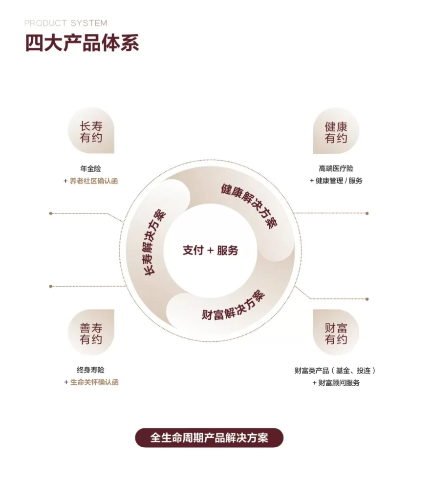“幸福有约”的开拓性创新,将保险支付转化为可感知的服务权益,以保险筹资链接客户从个人到家庭、家族,覆盖全生命周期、全财富周期的健康财富管理需求。“幸福有约”目前已形成“长寿有约、健康有约、财富有约、善寿有约”四大产品体系,及覆盖“健康、财富、艺术、慈善、教育、礼遇”的六大私享服务体系。