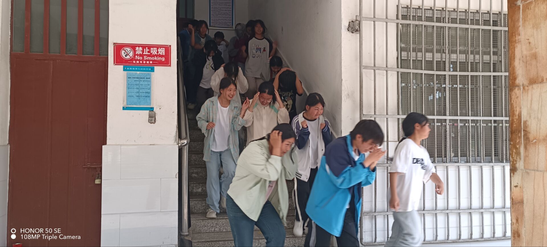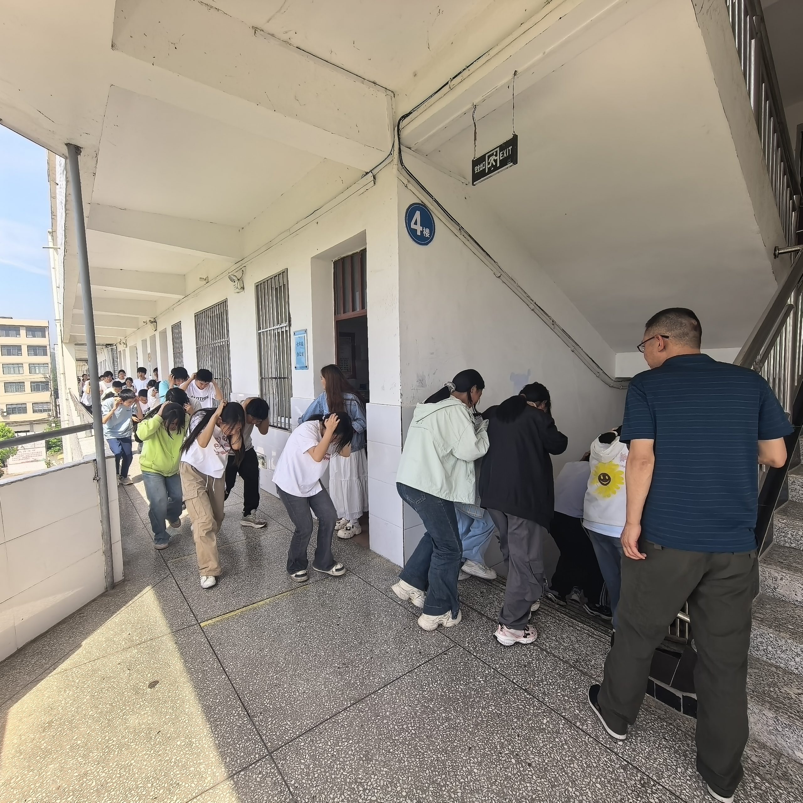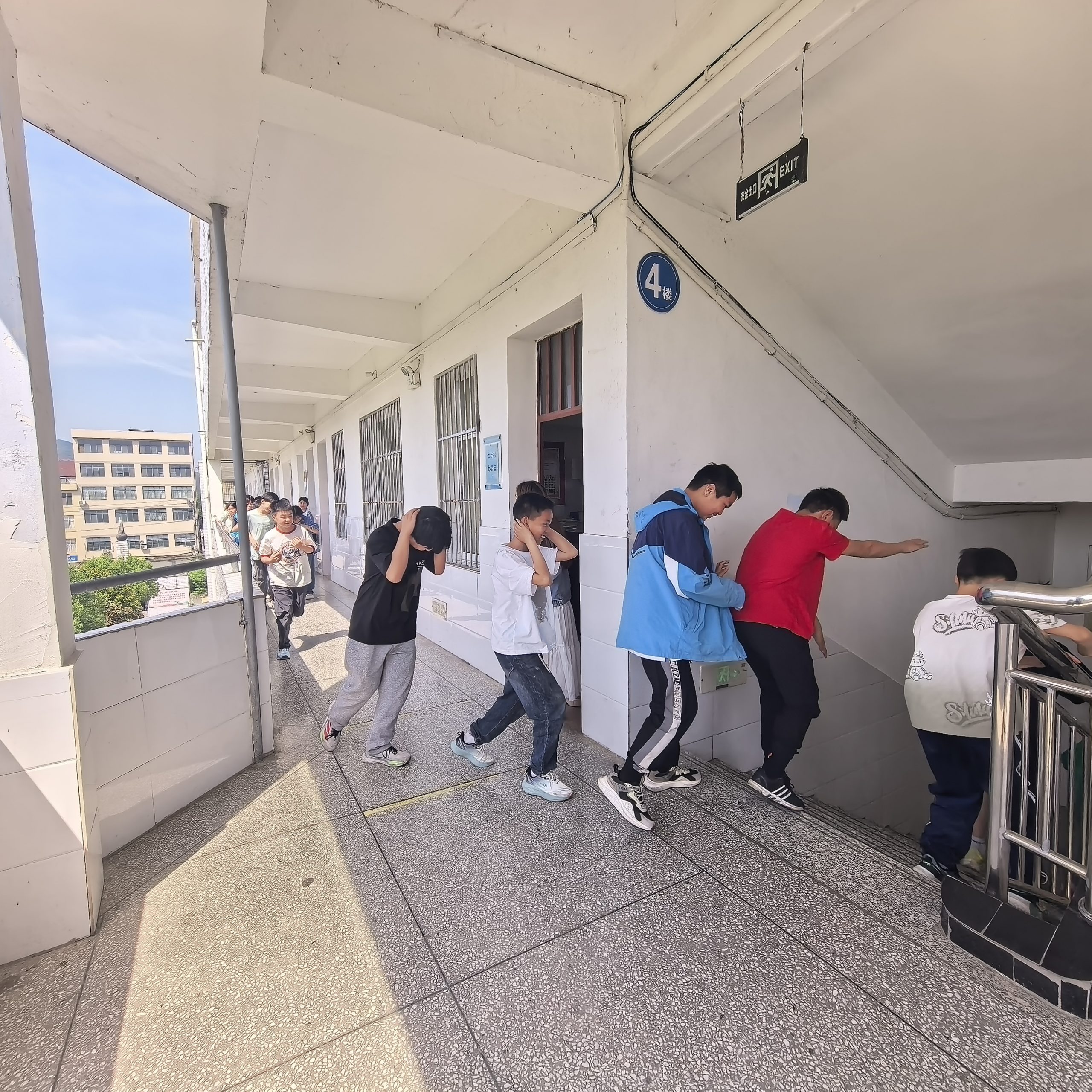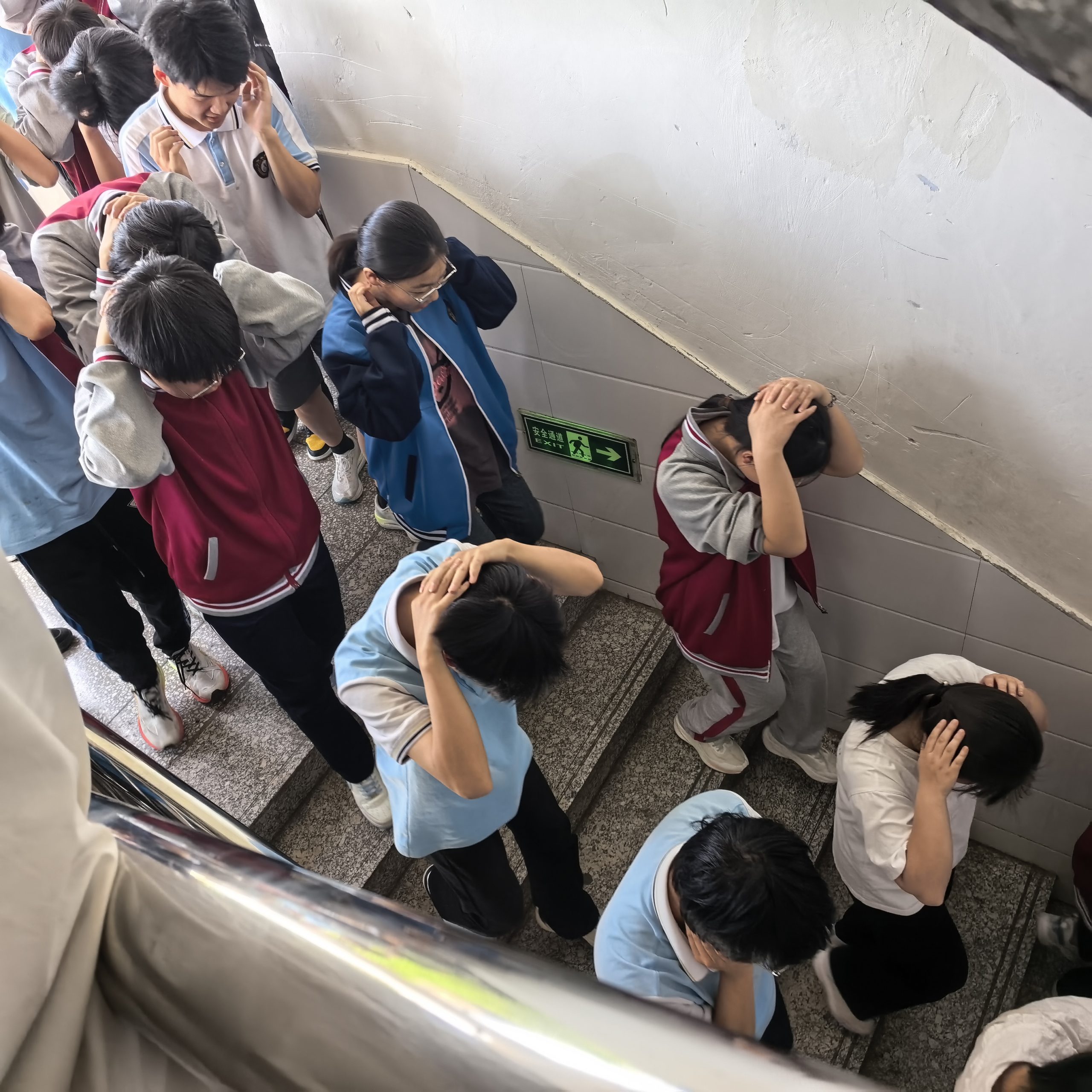 随着警报拉响,正在二至四楼教室上课的学生们迅速行动起来。二楼班级的学生在老师的指挥下,第一时间弯腰低姿,用手或书本护住头部,快速且安静地向教室外撤离。他们沿着预定的疏散路线,稳步小跑,迅速向操场安全区域前进。