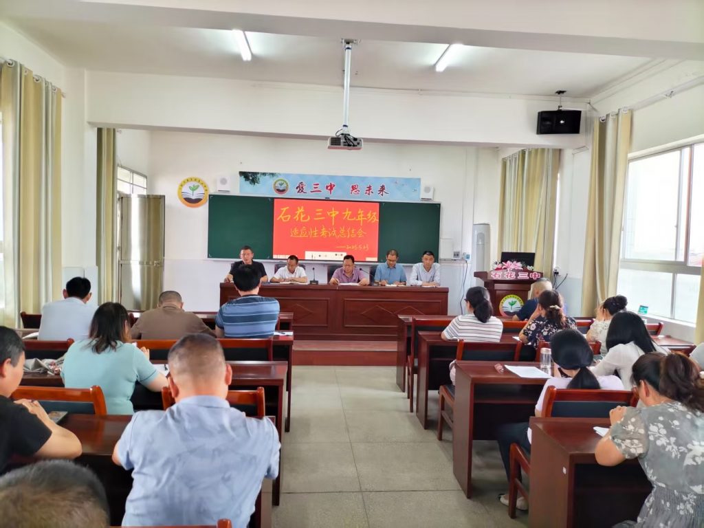 湖北谷城讯 (陈超 李清海) 5月23日,谷城县石花镇第三初级中学召开九年级适应性中考总结分析会,旨在全面剖析本次适应性考试情况,为即将到来的中考冲刺阶段提供科学指导,明确方向。