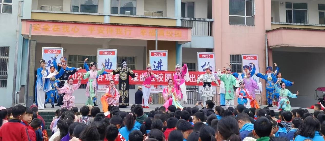 活动伊始,县戏曲传承中心的演员们便以经典湖北越调《打焦赞》选段拉开帷幕。一上场,饰演杨排风的年轻演员就以其旋转如飞的棍花技艺,演绎出杨排风的飒爽英姿,赢得了全场雷鸣般的掌声。展演现场,生、旦、净、末、丑行当齐全,文戏武戏交相辉映。演员们身着精致戏服,以婉转的唱腔、细腻的身段,将角色情感演绎得淋漓尽致,地道的乡音瞬间拉近了与师生的距离。台下掌声、喝彩声此起彼伏。
