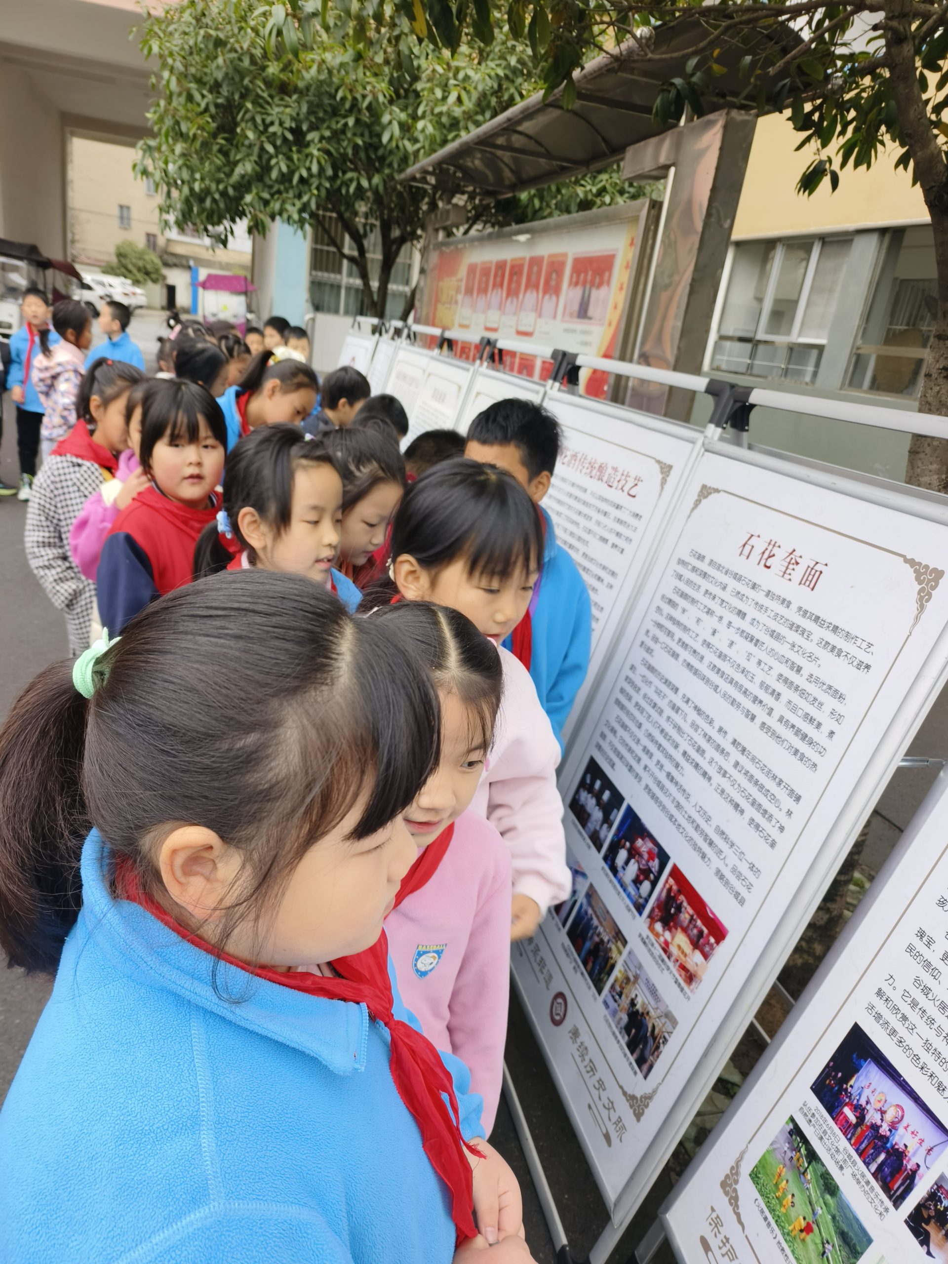 戏曲节目表演完毕,孩子们按班级有序的参观了“非遗知识长廊”,图文展板详细介绍湖北越调的历史渊源、县内非遗项目的传承故事。