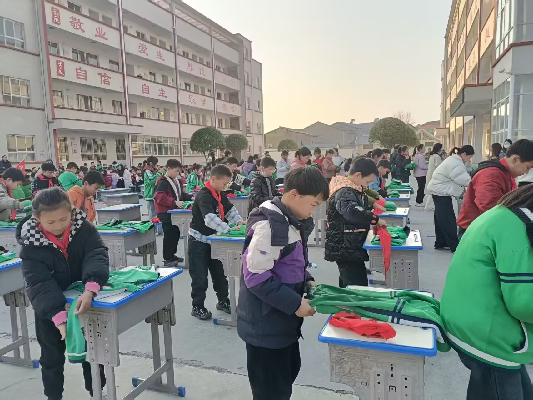 活动分年级比拼生活技能。一二年级学生整理书包,快速将书本、文具分类收整;三四年级学生熟练系鞋带,手指翻飞间打出整齐蝴蝶结;五六年级学生叠衣服,平铺对折、整理边角,衣物方正如“标准样板”。赛场上选手全神贯注,场下加油声不断。评委依据速度与质量评分,最终评选出各年级“劳动小标兵”。
