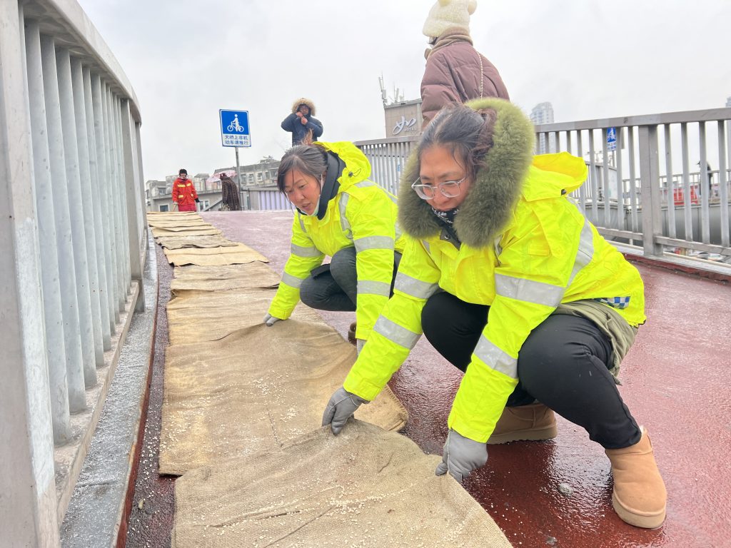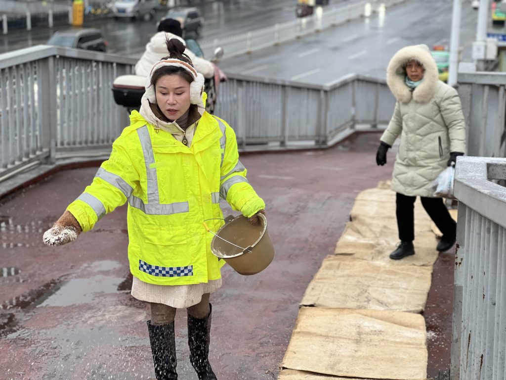 当时早上7时许,天刚亮,王雪琴早早率领市政站网女子别动队先期抵达,她们规范警戒后,开始抛洒融雪剂,手持铁锹、雪铲快速清扫积雪、破除桥面结冰,并有序铺设防滑麻袋。
