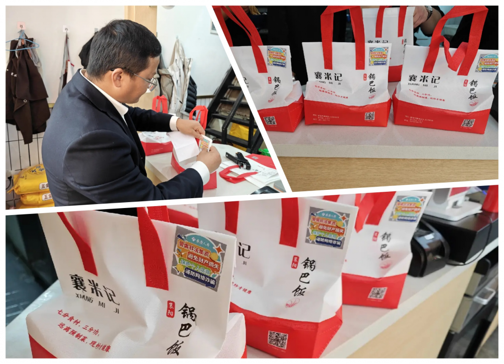 活动当天,一张张印有防范非法集资、识别电信诈骗、保护个人信息、理性投资等内容的彩色贴纸,被郑重地贴在了即将出发的外卖包装袋上。这些小小的贴纸,随着外卖骑手的送餐箱,穿梭于襄阳市的大街小巷,成为流动的“金融知识宣传站”。