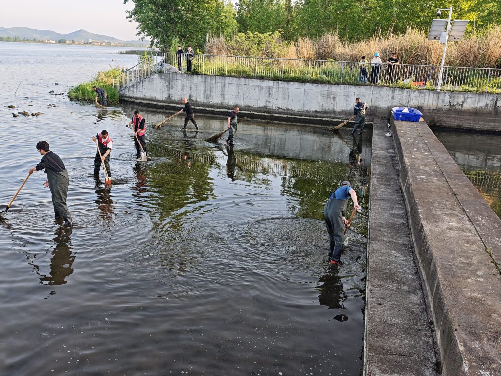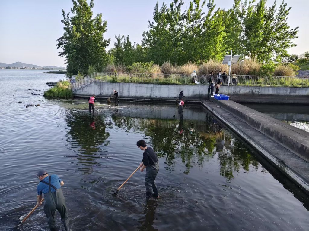 襄阳市市政管理处泵站管网管理一所所长曾辉带领10余名党员干部志愿者,身着防水衣裤蹚入齐膝深的汉江河床,手持长杆网兜、铁铲,对雨水入江排口区域滋生的水草、藻类和漂浮杂物进行拉网式清理,用精细化的暖心行动守护汉江水质与汛期排水安全。
