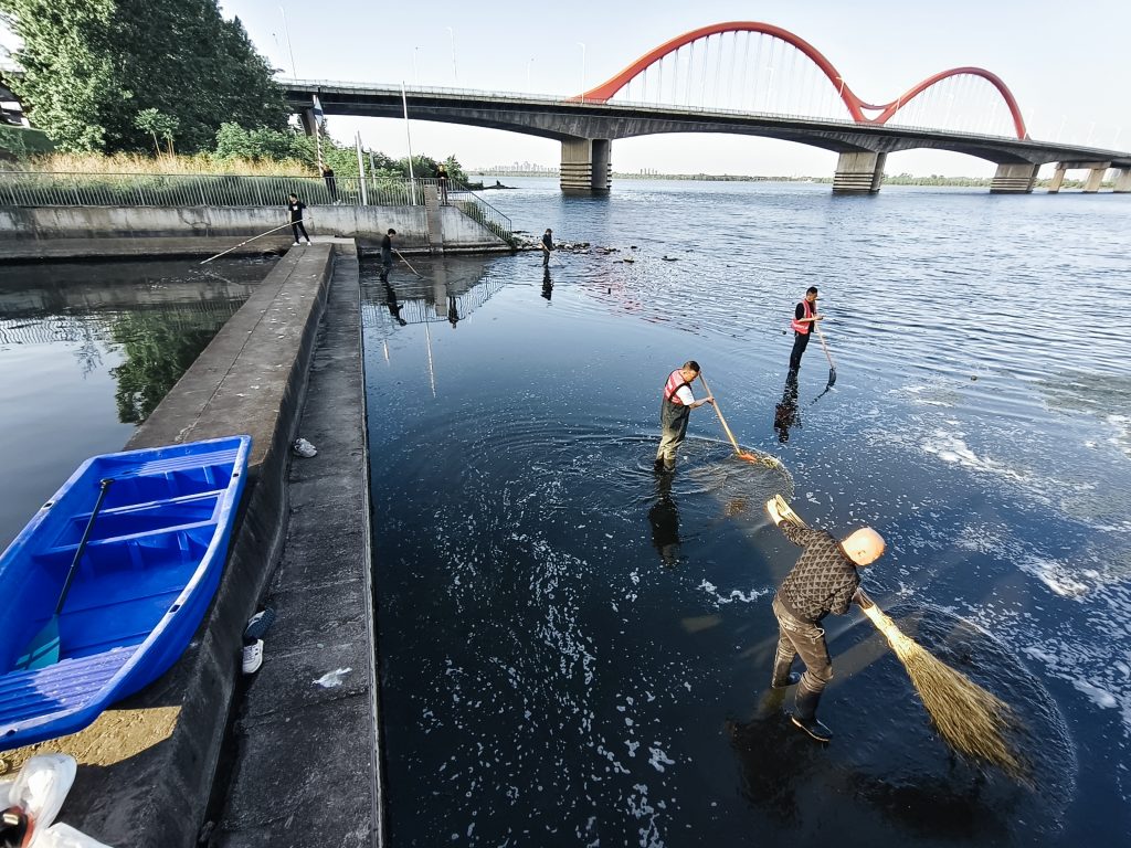 岸边,不少市民驻足观看后也自发加入清捞队伍,大伙儿不怕脏、不怕累,汗水浸湿了衣衫,却依然干劲十足,直至行动圆满结束。