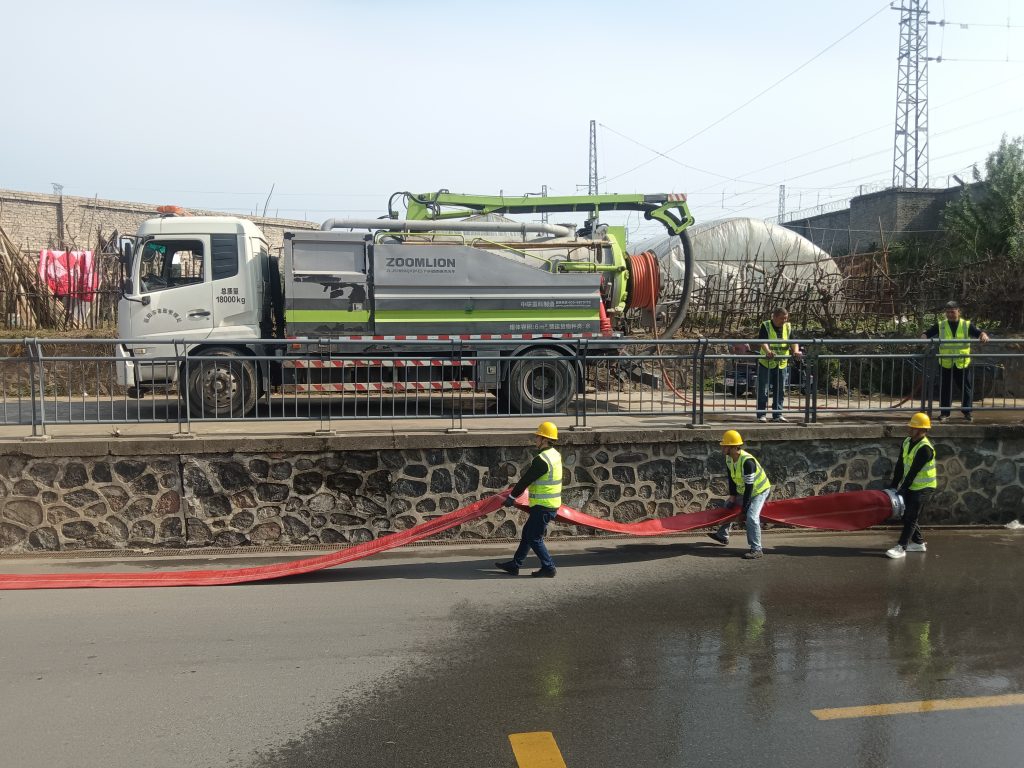 两辆“龙吸水”同时启动,“机器人”子车在操作人员远程操控进入泥泞涵洞等人工难以抵达的涵洞积水底部,直径30厘米的排水管高速运转,母车通过油管实时供能。