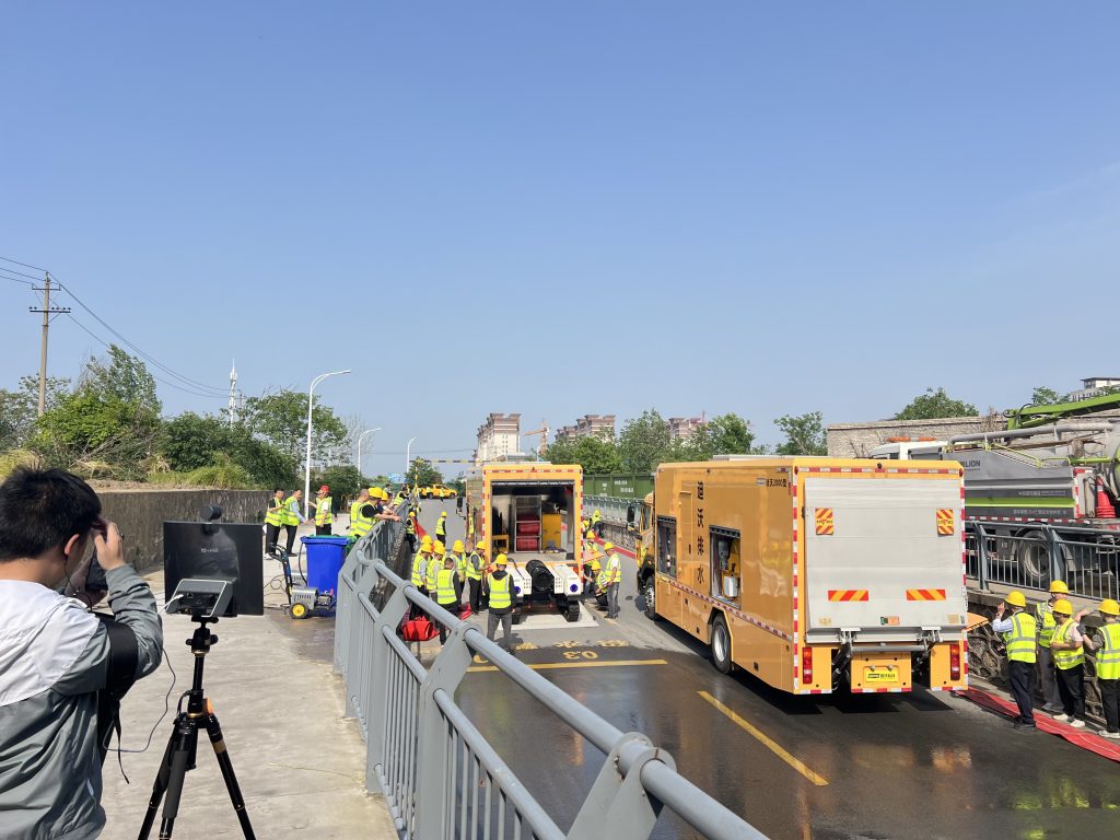 该车通过远程控制履带式“机器人”子车深入涵洞积水深处,仅用1小时抽排完一标准游泳池(约2100立方米)积水,展现强劲应急能力。