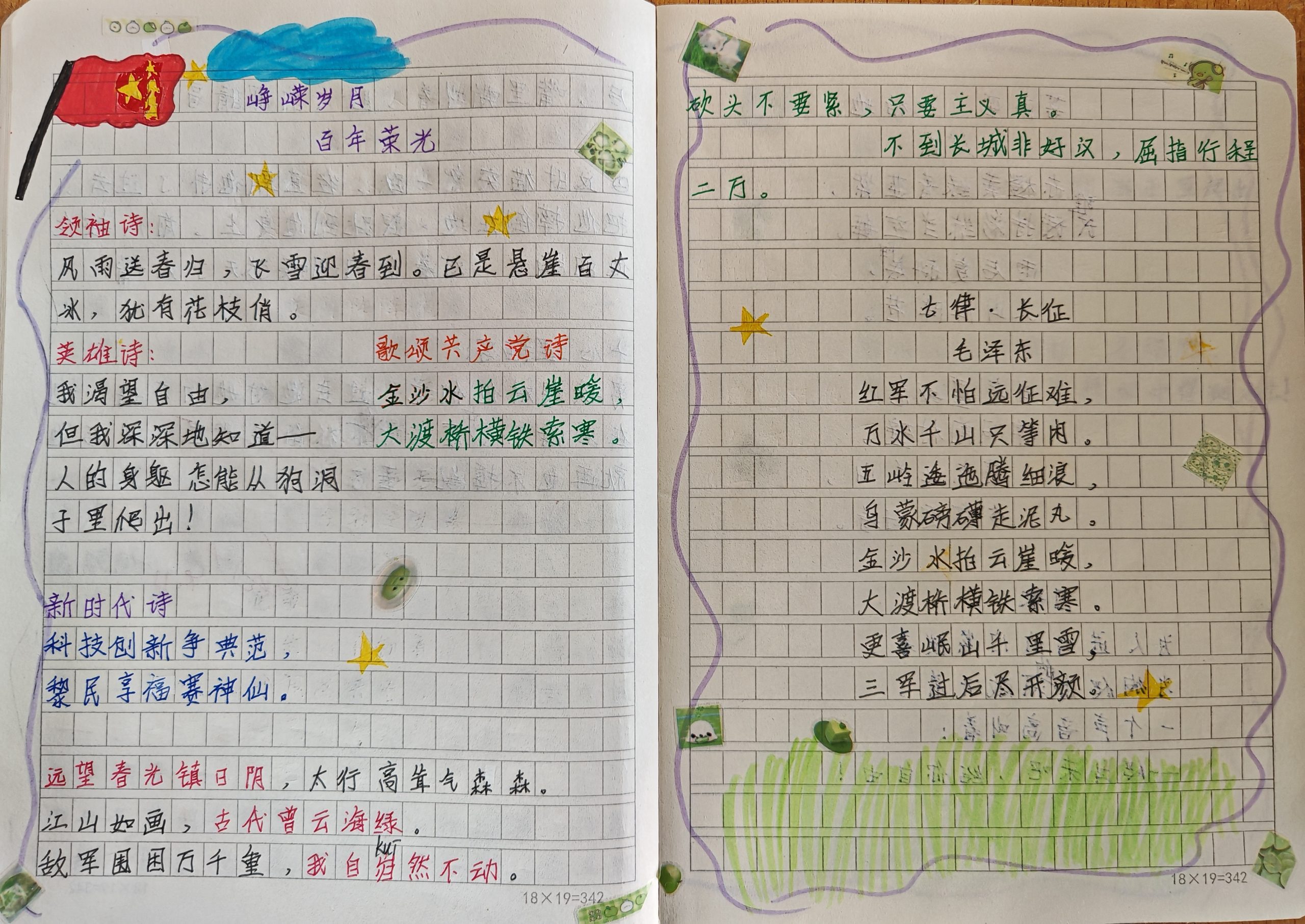 在班级活动现场,同学们专注书写、认真创作,一笔一画间满是对红色诗词的敬意。有的同学用渐变的色彩描绘红旗飘扬,有的用细腻的笔触勾勒长征路上的山水,还有的用星星、花朵点缀诗行,让红色诗词在少年的创意中焕发新的生机。