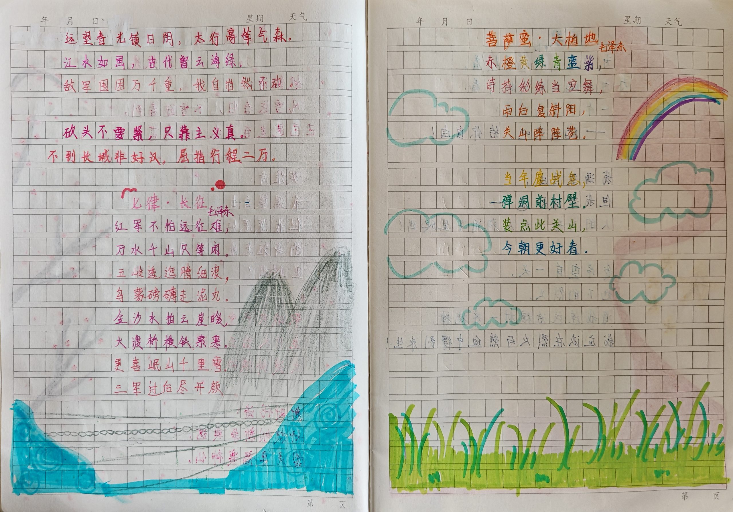 活动中,同学们从课本里的红色诗词入手,品读革命先辈的家国情怀。叶挺将军的《囚歌》里,“人的身躯怎能从狗洞子里爬出”的铮铮铁骨,被同学们用火焰与红旗的色彩定格;毛泽东同志的《七律·长征》中,“金沙水拍云崖暖,大渡桥横铁索寒”的壮阔场景,化作了笔下翻涌的江河与巍峨的青山;《卜算子·咏梅》《菩萨蛮·大柏地》等经典诗词,也被同学们用梅花、彩虹、青山等意象,赋予了少年视角的诗意表达。